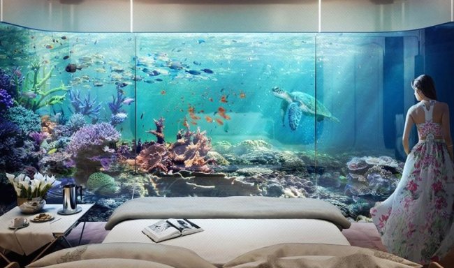 Каждый плавучий дом-корабль имеет три яруса – основной этаж на уровне моря, верхнюю палубу и нижний уровень, который полностью находится под водой. Подводный ярус включает в себя просторную спальню и ванную комнату. Панорамные окна которого, простирающиеся от потолка до пола открывают живописнейшие виды на коралловые рифы и их обитателей.