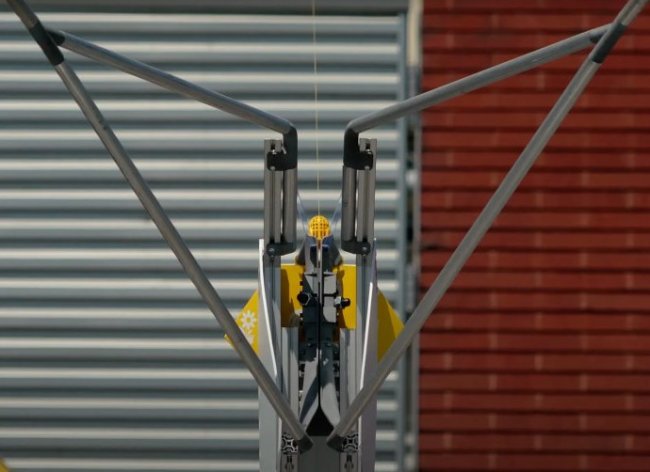 Устройство для погрузки занимает примерно одно парковочное место, причем большая часть пространства остается свободной, чтобы не было помех для работы дрона. На высокой штанге есть V-образная вилка, которая «ловит» спускаемый с дрона на тросе крюк. Он перемещается по специальному желобу и на выходе цепляет ушко пакета с посылкой, после чего крюк поднимается и дрон отправляется в полет.