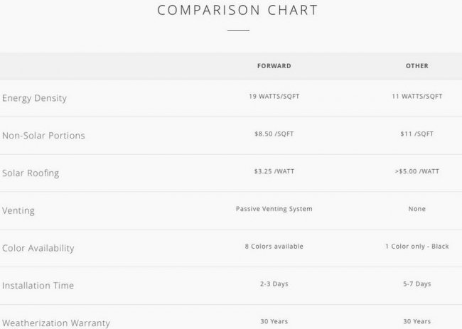 Глава Forward Labs утверждает, что его кровельные системы имеют ряд особенностей, которые выгодно отличают ее от обычных фотоэлектрических модулей и солнечных крыш других производителей. По его словам, конструкция покрытия представляет собой пятислойный материал, состоящий из стекла, оптической прокладки, фотоэлементов и изоляции, которые помещены на цельный металлический каркас. Причем все это собирается на заводе и является полностью интегрированным, в отличие от решений, которые предполагают сборку на месте. Верхние слои наложены поверх оцинкованной металлической основы, которая практически неотличима от «несолнечных» участков крыши.