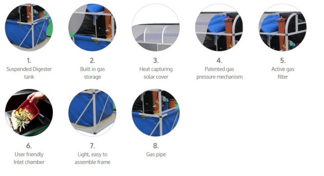 В компании HomeBioGas Ltd заявляют, что в регионах, где среднесуточная температура превышает 17 C, их биогазовая система может эффективно перерабатывать до 15 литров навоза домашнего скота или помета птицы, а также до 6 литров пищевых отходов в день. При этом вырабатываемого газа будет достаточно для работы кухонной плиты на протяжении 3 часов. В качестве своеобразного «бонуса» установка производит экологически чистое и естественное жидкое удобрение для домашнего огорода.