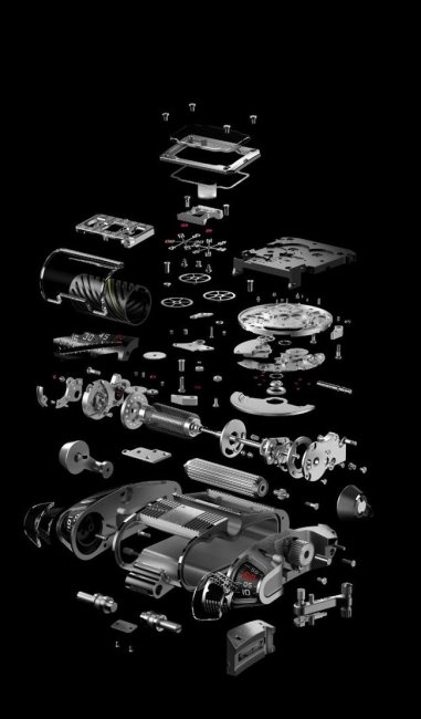 Чтобы узнать текущее время, владельцу часов Urwerk UR-100C не придется поворачивать запястье. Главная информационная панель расположена на торце корпуса, примерно на боковой стороне руки и потому сразу бросается в глаза. Здесь нет стрелок и экранов, все индикаторы механические и движутся каждый по своей оси, а наклонная минутная лента и вовсе закручивается под сложным углом справа налево, пробегая значения от 5 до 60 и возвращаясь в исходное положение с одновременным переключением остальных счетчиков. Авторы говорят, что синхронизация работы этого узла – самое сложное в данных часах.