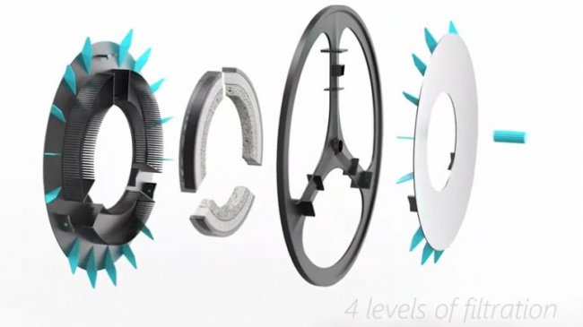 Принцип работы фильтра-колеса очень прост. Когда велосипед двигается, расположенные на колесном диске ребра нагнетают воздух внутрь колеса, где он проходит через фильтры и выводится наружу уже чистым. Используемые фильтрующие элементы можно чистить и использовать повторно. Колесный диск легко разбирается для простоты обслуживания и замены фильтров.