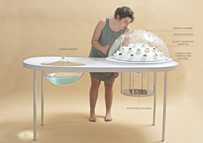 Жидкий питательный раствор с ростками гриба заливают в коконовидный сосуд и процесс переработки начинается. Каждый сосуд - это емкость, состоящая из агар-агара, морских водорослей на основе вещества, называемого "FU", и из полосок пластика, обработанных ультрафиолетовым светом для стерилизации. На протяжении нескольких недель мицелий или нитевидная и вегетативная часть гриба, медленно поглощает пластик и агар-агар, заменяя их пищевым продуктом.