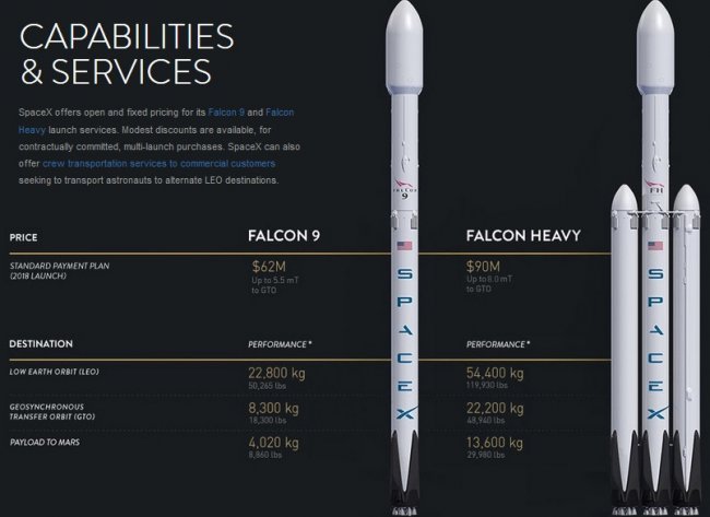 Плюс ко всему, компания начала предлагать услугу осуществления грузоперевозок на Марс. За 62 миллиона долларов Space X, используя ракету Falcon 9, доставит на красную планету груз весом 4020 килограмм. Ракета Falcon Heavy сможет доставить груз весом 13 600 килограмм, и стоить это будет 90 миллионов долларов.