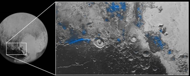 Кроме того, New Horizons обнаружил на Плутоне небольшие ледяные образования, расположенные на открытой поверхности. Любопытным фактом является то, что самые явные участки льда, полученные с помощью спектрального анализа, соответствуют ярко-красным областям на фотографиях планеты, сделанных немногим ранее. Ученые пока не могут объяснить красный цвет льда, однако полагают, что это как-то связано с все теми же толинами.