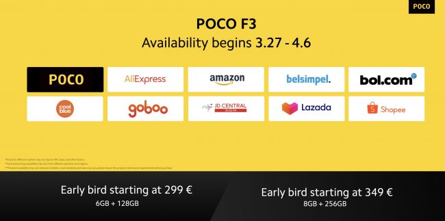 - POCO F3 6/128 ГБ — 299 евро (потом 349 евро)