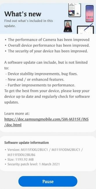 Как сообщает издание SamMobile, аппарат начал получать One UI 3.1. Прошивка имеет номер сборки M315FXXU2BUC1 и весит 1 ГБ. Её пока что выпустили для пользователей устройства в Индии. В других регионах обновление появится в ближайшие дни.