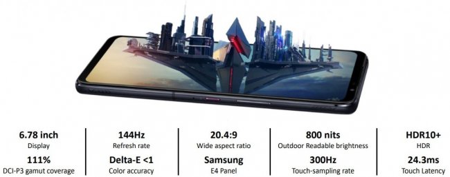 ASUS ROG Phone 5 оснастили большим 6.78-дюймовым AMOLED-дисплеем Samsung. Он получил разрешение FHD+, адаптивную частоту развёртки до 144 Гц, частоту считывания 300 Гц, поддержку HDR10+, а также 111% охвата цветового пространства DCI-P3 и 151% sRGB. Максимальная яркость панели составляет 800 нит.