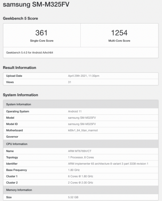 Речь идёт про Galaxy M32. Новинка «засветилась» в базе данных теста производительности Geekbench с номером модели SM-M325FV. В отчёте говорится, что гаджет будет работать на восьмиядерном 12-нанометровом процессоре MediaTek Helio G80 (MT6769V) в паре с 6 ГБ оперативной памяти. Также устройство получит предустановленную версию ОС Android 11 с фирменной оболочкой One UI 3.1.