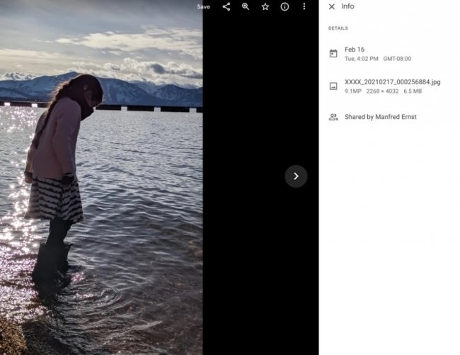 Есть еще один снимок девушки, стоящей в водоеме, который был сделан 16 февраля. Описания нет, но тот факт, что он был сделан через несколько месяцев после других фотографий, является убедительным свидетельством того, что он тоже был сделан на камеру Pixel 5a.