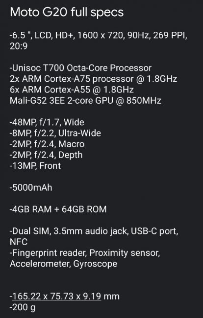 Речь идёт о модели Moto G20. Аппарат получит пластиковый корпус с двумя расцветками и его оснастят 6.5-дюймовой LCD-панелью с разрешением HD+ и частотой обновления 90 Гц. Новинка, согласно утечке, будет работать на новом процессоре Unisoc T700. Ему приписывают два ядра Cortex-A75 с частотой 1.8 ГГц, шесть ядер Cortex-A55 на 1.8 ГГц и видеоускоритель Mali-G52 3EE. Чип будет поставляться в паре с 4 ГБ ОЗУ.