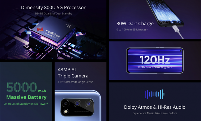 Аппарат оснастили 6.5-дюймовым LCD-дисплеем с отверстием. Экран имеет разрешение Full HD+, а также частоту развёртки 120 Гц и частоту считывания сенсора 180 Гц. Под капотом новинки установили восьмиядерный процессор MediaTek Dimensity 800U, который вышел в августе прошлого года. Это 7-нанометровый чип c ядрами Cortex-A76 на 2.4 ГГц и Cortex-A76 на 2.0 ГГц. SoC имеет видеоускоритель Mali-G57 и встроенный 5G-модем. Он поддерживает сети sub-6GHz, SA и NSA.
