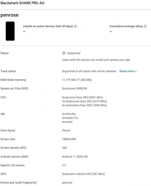 Указаны некоторые характеристики смартфона: Android 11, 12 ГБ оперативной памяти и дисплей FullHD+. В качестве процессора обозначен SM8250, то есть Snapdragon 865. Но это, скорее всего, ошибка, так как новым Black Shark 4 приписывают топовый Snapdragon 888.