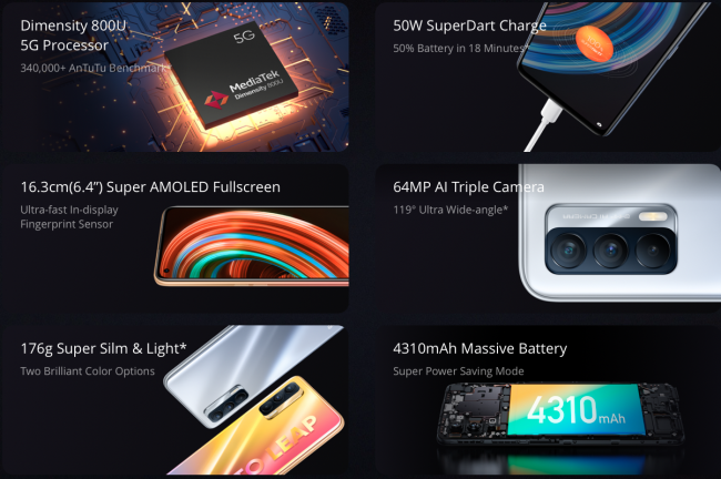 Аппарат отличается от китайской модели. Он стал копией Realme V15, который показали в начале января. Новинка получила 6.4-дюймовый AMOLED-дисплей с разрешением Full HD+. Экран поддерживает частоту считывания касаний 180 Гц и пиковую яркостью 600 нит. Панель имеет встроенный сканер отпечатков пальцев, а также отверстие для фронтальной камеры на 16 МП. За производительность глобальной версии Realme X7 отвечает чип Dimensity 800U, а за автономность — батарея на 4310 мАч с 50-ваттной зарядкой. Основная камера в новинке тройная с датчиками на 64 МП + 8 МП + 2 МП. Поставляться аппарат будет с оболочкой Realme UI 2.0 и в двух модификациях: 6/128 ГБ или 8/128 ГБ.