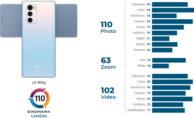 «Поскольку в последние пару лет дизайн смартфонов и инновации в экранах несколько застопорились, приятно видеть что-то совершенно уникальное от LG. Однако LG Wing менее революционен в нашем анализе качества изображения. По большей части он достаточно компетентный, с хорошей цветопередачей, точной целевой экспозицией и хорошо контролируемым шумом — его главные достоинства. Однако серьезная нестабильность автофокуса и экспозиции вызывает беспокойство, и в целом уровень детализации довольно низкий. То же самое и с видео, где стабильная работа по основным параметрам экспозиции, цвета, деталей и шума подрывается проблемами с автофокусом и стабилизацией», — подытожили в DxOMark.