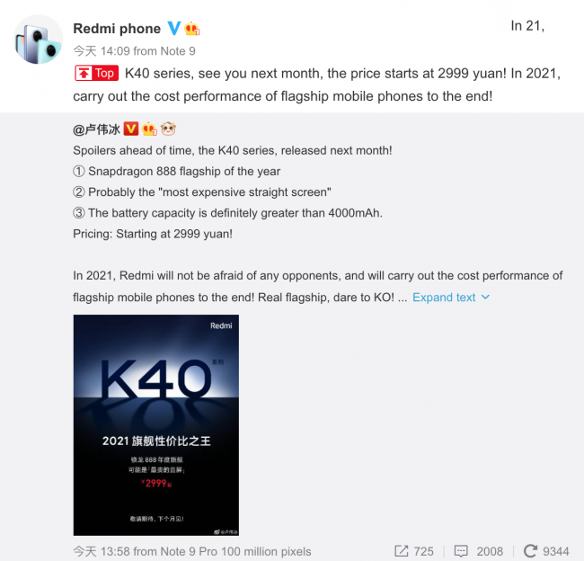 Согласно тизеру, топовая модель линейки (Redmi K40 Pro?) сможет похвастаться 5-нанометровым процессором Qualcomm Snapdragon 888. Также аппарат должен получить аккумулятор больше 4000 мАч и OLED-дисплей с частотой обновления картинки 120 Гц.