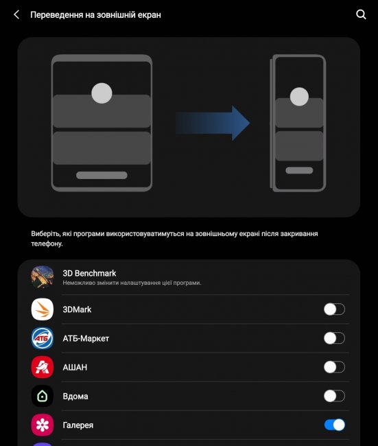 Но есть и настройки, уникальные для Galaxy Z Fold2. Отдельный пункт меню позволяет включить приложения, которые продолжат свою работу на внешнем экране после закрытия смартфона (и наоборот).