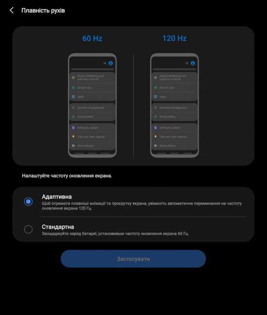 Как и у любого другого AMOLED производства Samsung, у этих экранов есть два основных режима работы — естественные и насыщенные цвета. Понятное дело, по умолчанию стоят насыщенные, которые позволяют полностью раскрыть возможности экранов. Для любителей поковыряться ручками, есть возможность включить фильтр синего цвета (он реально завышен, как нам покажет позже колориметр) или настроить цветовые RGB-каналы по своему усмотрению. В режиме естественных цветов этого управления нет — все отдается «как есть». Как и все новые флагманы Samsung, Fold2 поддерживает адаптивную частоту обновления экрана (только внутреннего) до 120 герц. Управлять этим процессом вручную нельзя — автоматика сама выбирает что нужно пользователю в данный момент — большая плавность движений или уменьшенное энергопотребление.
