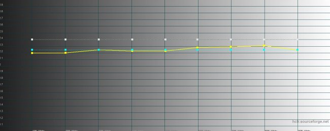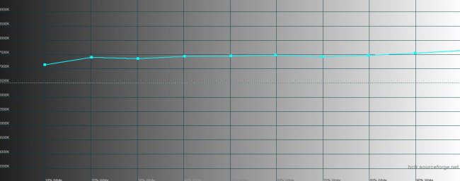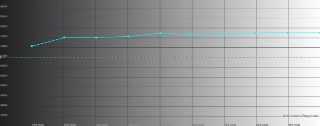 У основного дисплея ситуация, в общих чертах, повторяется. С той лишь разницей, что цветовой охват не дотягивает до цветового пространства sRGB в красном, но так же превышает его, как и внешний дисплей, в зеленом. Цветовая температура уже не так сильно скачет в темных тонах, а яркость синего превышает идеальный показатель за исключением темной части градиента, где она почти в норме.