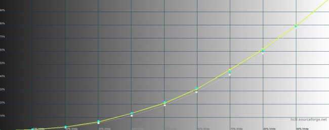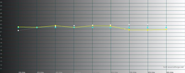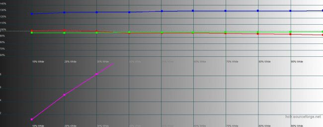 Наконец, последний тест показывает, что цветовой охват основного дисплея в режиме насыщенной цветности превышает цветовой охват sRGB (особенно в синей и зеленой части спектра), а цветовая температура показывает три разных уровня в темных, средних и светлых тонах градиента, то есть страдают светлые цвета изображения, отображающиеся чуть ярче, чем стоило бы. Зато уровень синего повышен не так сильно, как у внешнего дисплея.