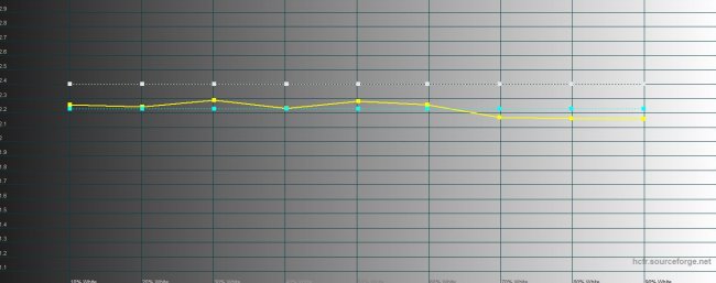 Цветовой охват экрана в этом режиме чуть превышает цветовое пространство sRGB в зеленом цвете, который выглядит ярче, чем хотелось бы. Цветоовая температура стабильно повышенная, но чуть проседает в темных тонах, то есть более светлые участки уходят сильнее в холодную часть спектра. График цветовых составляющих показывает повышенный синий цвет, характерный для всех OLED-экранов.