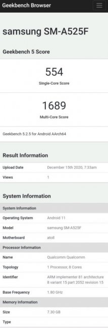 Информацией поделилось немецкое издание GalaxyClub. Смартфон с номером модели SM-A525F заметили в базе данных теста Geekbench. В отличие от Galaxy A52 5G, Galaxy A52 4G получит чип не Snapdragon 750G, а более простой Snapdragon 720G. Этот восьмиядерный SoC работает на максимальной тактовой частоте 2.3 ГГц. Кроме процессора, в отчёте также говорится, что новинка будет иметь 8 ГБ оперативной памяти и операционную систему Android 11 из коробки.