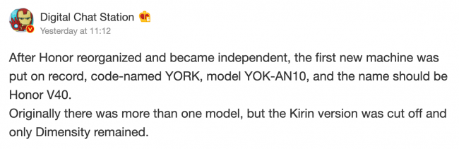 Согласно утечке, Honor V40 — это будет первый смартфон бренда после отделения от Huawei. Аппарат проходит с номером модели YOK-AN10 и кодовым названием YORK. Кстати, инсайдер подтвердил, что ждать чип Kirin в устройстве не стоит. Аппарат точно будет работать на процессоре MediaTek. Если верить предыдущим утечкам, речь идёт о SoC MediaTek Dimensity 1000+, хотя есть также вероятность, что смартфон оснастят новым 6-нанометровым процессором MT6893. Его должны выпустить в ближайшее время.
