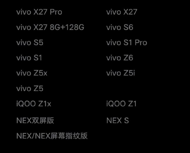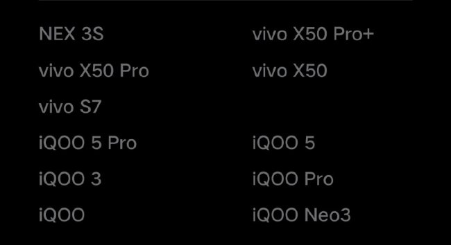 Ближе к Китайскому Новому Году (12 февраля) тестовая прошивка станет доступна также на смартфонах Vivo Nex 3, Vivo Nex 3 5G, Vivo X30, iQOO Neo и iQOO Neo 855, а во втором квартале 2021 года планируют обновить Vivo X27, Vivo X27 Pro, Vivo S5, Vivo S1, Vivo Z5, Vivo Z5x, Vivo S6, Vivo S1 Pro, Vivo Z6, , Vivo Nex, Vivo Nex S, iQOO Z1x и iQOO Z1.