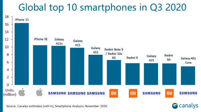 Самым продаваемым смартфоном снова стал iPhone 11. За третий квартал 2020 года Apple отгрузила по всему миру больше 16 млн таких устройств. На втором месте разместился ещё один аппарат купертиновцев — iPhone SE (около 10 млн). На третьем месте стоит бюджетный Android-смартфон Galaxy A21s, а на четвёртом — Galaxy A11. Замыкает пятёрку лучших Galaxy A51.