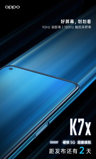 Производитель опубликовал в социальной сети Weibo тизер OPPO K7x, согласно которому аппарат оснастят дисплеем с частотой обновления 90 Гц. Кроме этого, экран будет иметь IPS-матрицу, отверстие для фронтальной камеры и частоту считывания сенсора 180 Гц. Смартфон ещё получит обычный сканер отпечатков пальцев. Его разместят на боковой грани устройства.