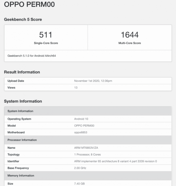 Работать OPPO K7x будет на восьмиядерном чипе MediaTek Dimensity 720. Это подтверждает тест производительности Geekbench. Также новинке приписывают основную камеру с датчиками на 48 Мп + 8 Мп + 2 Мп + 2 Мп, 6/8 ГБ ОЗУ, 64/128/256 ГБ ПЗУ и батарею на 5000 мАч с быстрой 30-ваттной зарядкой.