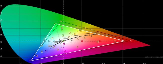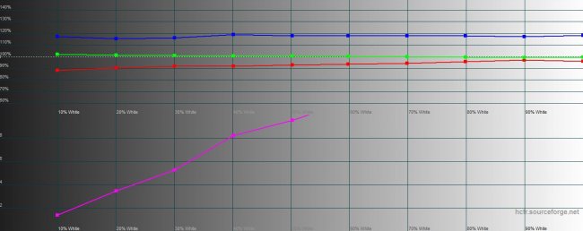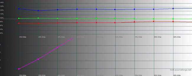 В режиме насыщенного цвета экран еще больше уходит в более широкий цветовой охват, чем определенные цветовым пространством sRGB рамки. Но мне, как пользователю, повторюсь, такая картинка нравится больше. А для тех, кто беспокоится вопросом (например, важно, чтобы фото на экране выглядело натурально, а не ярче, чем на самом деле на снимке — поэтому наши фото на экранах смартфонов часто выглядят симпатичнее, чем на экранах компьютеров) и есть блок ручных настроек экрана вплоть до каждого из трех каналов RGB.