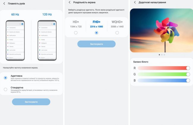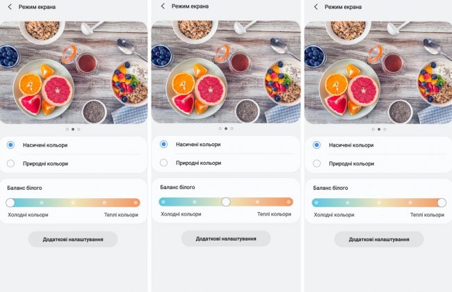 Предпочтения пользователя по цветовой температуре управляются тремя способами: простым, очень простым и мудреным для тех, кто не боится трудностей и любит экспериментировать. Что не удивительно, с учетом целевой аудитории смартфона — как я уже писал, серию Galaxy Note всегда ценили гики и технари. Можно переключить настройки между природными или насыщенными цветами, выбрать один из пяти вариантов баланса белого, сместив спектр в сторону холодных или теплых цветов. А можно, нажав кнопку дополнительных настроек добраться до управления каждым из RGB-каналов цветности (третий скриншот в первом блоке этого текста).