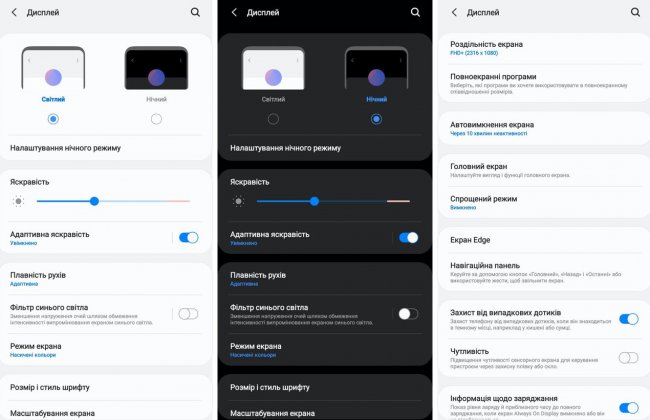 Настройки экрана занимают в меню две страницы. Помимо модной ночной темы, есть еще традиционное управление яркостью, автоматическим выключением. Можно настроить чувствительность экрана для работы в перчатках или через дополнительно наклеенную защитную пленку (она уже наклеена на заводе). Есть отдельная кнопка, включаяющая фильтр синего цвета и делающая цвета экрана ламповее теплее (в режиме насыщенных цветов синие действительно завышены — это показывают результаты замеров колориметром, о которых ниже).