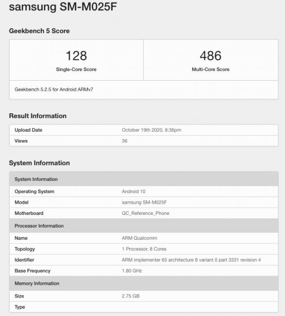 В базе данных теста производительности «засветился» Galaxy M02. Аппарат проходит с номером модели SM-M025F. Новинка работает под управление операционной системы Android 10. Кроме этого, в устройстве установлено 3 ГБ оперативной памяти и восьмиядерный процессор Qualcomm. Модель чипа в отчёте не указана, но скорее всего, это SoC Snapdragon 450.