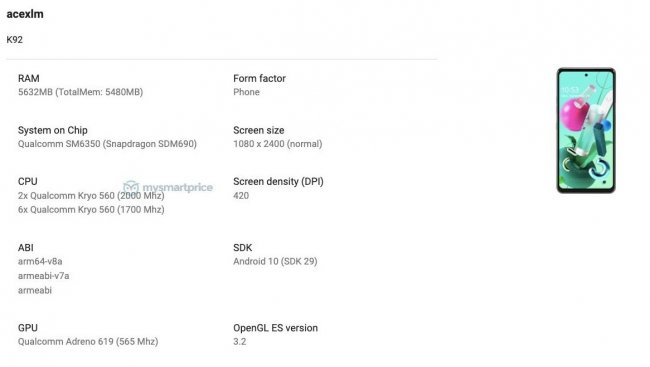 Утечка раскрывает некоторый спецификации устройства. Аппарат получит дисплей с разрешением Full HD (2400×1080p), соотношением сторон 20:9 и плотностью пикселей 420 ppi. Работать LG K92 5G будет под управлением процессора Qualcomm SM6350. Это кодовое имя чипа Snapdragon 690. Он построен по 8-нанометровому техпроцессу и имеет встроенный 5G-модемом. Кстати, ранее предполагалось, что смартфон получит более мощный SoC Snapdragon 765G.