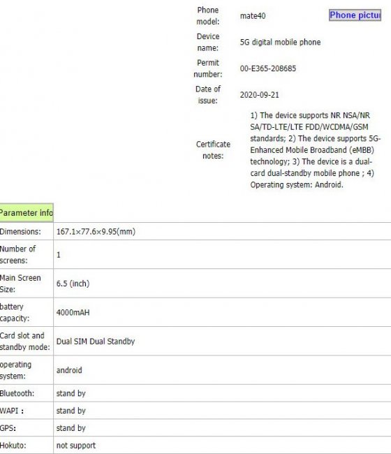 Итак, согласно утечке, Mate 40 оснастят 6.5-дюймовым дисплеем. Тип матрицы в документах не указан, но, с большой долей вероятности, это будет AMOLED-панель. Также смартфон получит аккумулятор на 4000 мАч, модем 5G и стеклянный корпус со следующими габаритами — 167.8×77.1×9.95 мм. Для сравнения, актуальная модель Huawei Mate 30 немного меньше (160.8×76.1×8.4 мм).