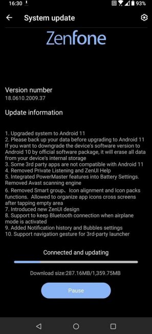 Система получила номер сборки 18.0610.2009.37 и весит 1.4 ГБ. В обновлении присутствуют все основные нововведения Android 11, включая обновлённый интерфейс, раздел Conversations в шторке уведомлений, обновлённое меню питания и многое другое. Также ASUS добавила в ПО несколько собственных изменений. Например, разработчики перенесли модуль PowerMaster в раздел «Батарея», установили поддержку жестов управления в сторонних лаунчерах, а также удалили умную группировку иконок приложений и обновили фирменную оболочку ZenUI.