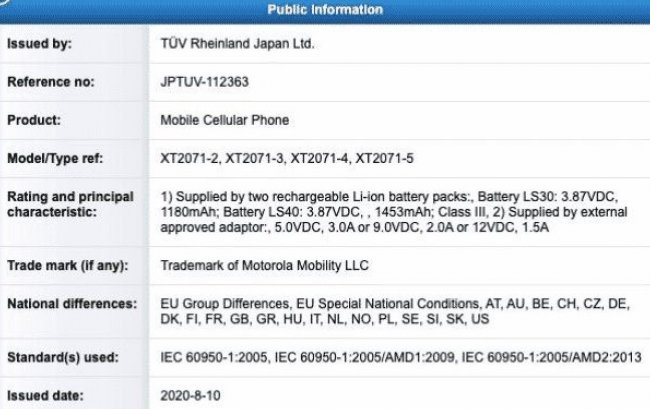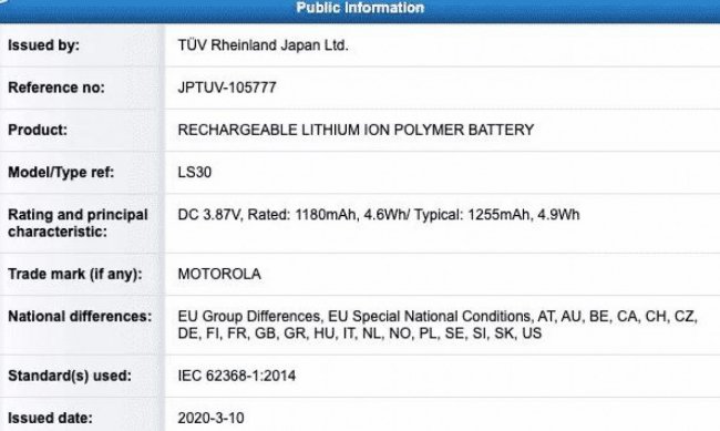 Аппарат заметили в сертификационном агентстве TUV Rheinland. Согласно утечке, новинка получит быструю зарядку на 18 Вт и два аккумулятора. Первый LS30 на 1180 мАч, а второй LS40 на 1453 мАч. Таким образом общая ёмкость батарей составит 2633 мАч. Для сравнения, в актуальной модели Motorola Razr установлена батарея на 2510 мАч с быстрой зарядкой на 15 Вт.