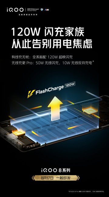 Производитель опубликовал тизер в социальной сети Weibo, согласно которому iQOO 8 и iQOO 8 Pro получат поддержку быстрой проводной зарядки на 120 Вт. Она будет заряжать аккумуляторы смартфонов до 100% всего за 15-20 минут. Кроме этого, старшая модель ещё сможет похвастаться беспроводной зарядкой на 50 Вт и даже реверсивной на 10 Вт.