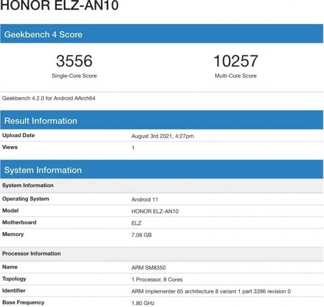 В тесте одного ядра Honor Magic 3 смог набрать 3556 баллов. В многоядерном режиме результат смартфона составил 10 257 баллов. Программное обеспечение подтверждает, что флагман будет оснащён мобильным процессором Snapdragon 888+ с пиковой частотой 2,995 МГц и 8 ГБ оперативной памяти, а в продажу поступит с предустановленной операционной системой Android 11.