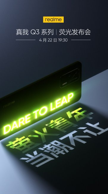 Информации про обычный Realme Q3 пока нет, а вот старшая версия сможет похвастаться жёлтой расцветкой с флуоресцентной надписью Dare to Leap, которая будет светиться в темноте.