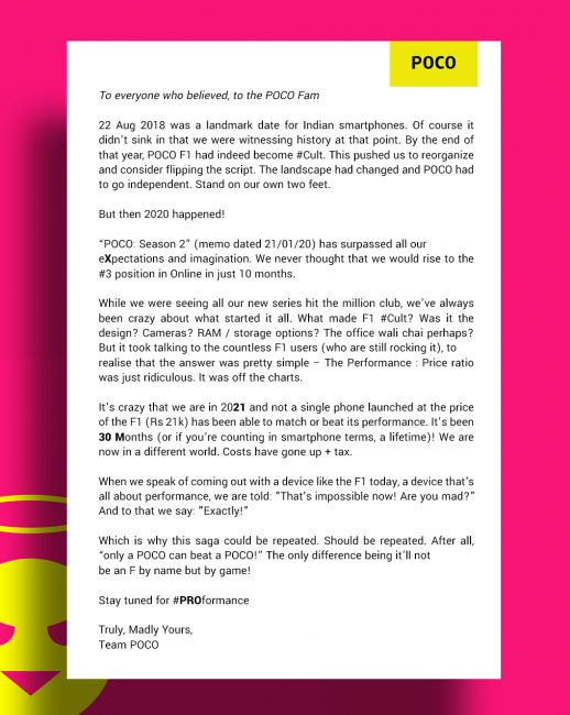 Бренд Poco опубликовал письмо своим пользователям, в котором, похоже, намекнул на выход нового смартфона.
