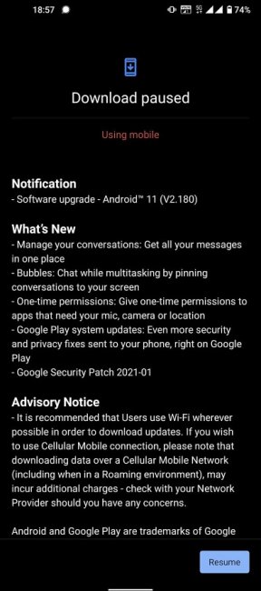 Из нововведений прошивка содержит январский патч безопасности, а также все основные особенности Android 11. Напомним, это обновлённый интерфейс, раздел Conversations (с англ. диалоги) в строке уведомлений, «пузырьковые» сообщения, обновлённое меню питания, панель Media Controls в шторке с быстрыми настройками, раздел с часто используемыми приложениями на рабочем столе и многое другое.