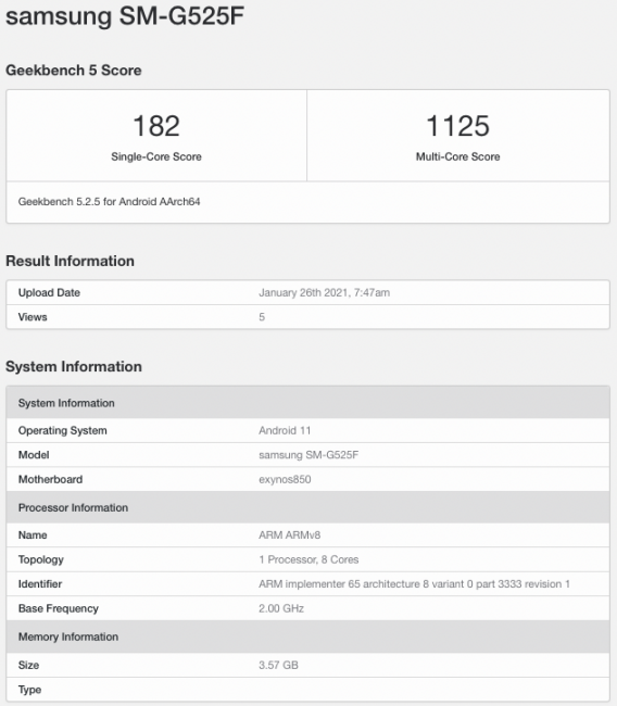 Издание SamMobile заметило Galaxy Xcover 5 в базе данных теста производительности Geekbench. Аппарат проходит с номером модели SM-G525F и работает на фирменном процессоре Exynos 850. SoC построен по 8-нанометровому техпроцессу LPP. Он имеет восемь ядер Cortex-A55 с частотой 2.0 ГГц, а также видеоускоритель Mali-G52. Кстати, в чипе нет встроенного 5G-модема, но поговаривают, что в смартфон его установят отдельно.