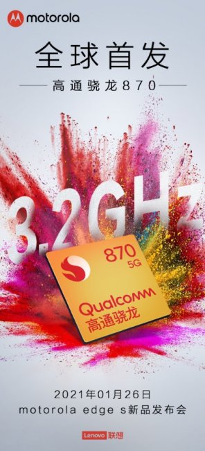 Итак, согласно официальному постеру, Motorola Edge S дебютирует на мероприятии в Китае 26 января. То есть новинку представят в следующий вторник. Кстати, на приглашении говорится, что аппарат будет работать на новом восьмиядерном процессоре Qualcomm Snapdragon 870, который имеет максимальную тактовую частоту 3.2 ГГц.