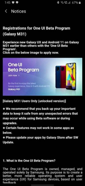 Речь идёт о бюджетнике Galaxy M31. Информация об этом появилась на официальном форуме компании. Принять участие в тесте могут пока только пользователи в Индии. В ближайшее время производитель должен расширить список стран.