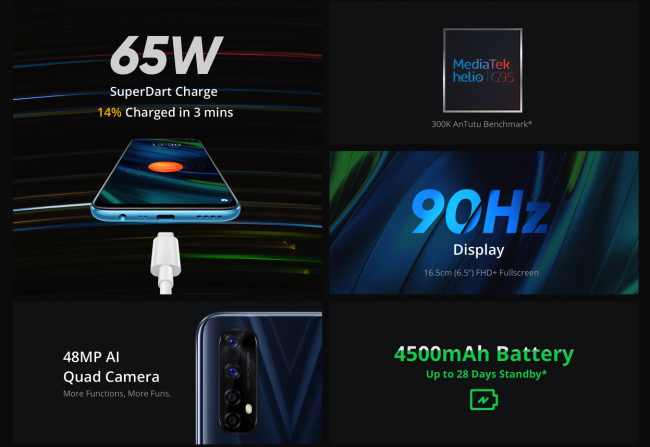 В линейку вошло три аппарата: Narzo 20, Narzo 20A и Narzo 20 Pro. Топовая модель Narzo 20 Pro получила 6.5-дюймовый IPS-дисплей с частотой 90 Гц и разрешением FHD+. Смартфон работает на процессоре MediaTek Helio G95, который недавно дебютировал в Realme 7. Чип поставляется в паре с 6/8 ГБ ОЗУ и 64/128 ГБ ПЗУ. В новинке установили основную камеру на 48 Мп + 8 Мп + 2 Мп + 2 Мп, фронтальную на 16 Мп, боковой сканер отпечатков пальцев, а также аккумулятор на 4500 мАч с 65-ваттной быстрой зарядкой и портом USB-C.