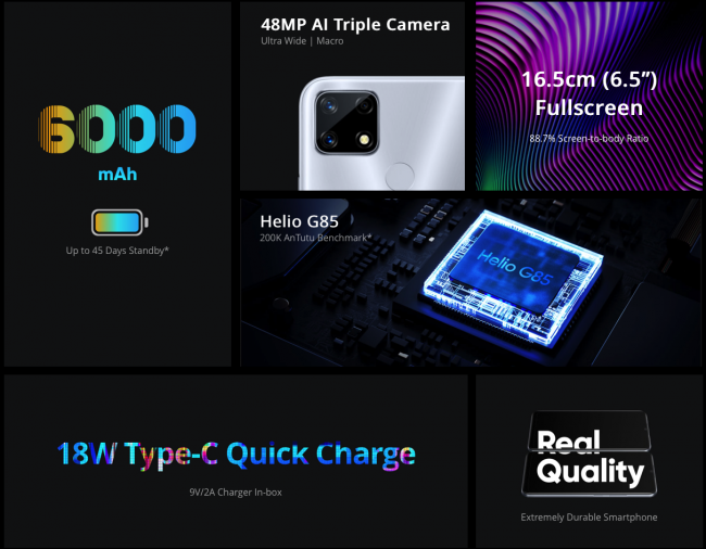 Realme Narzo 20A и Narzo 20, в свою очередь, также получили IPS-панели на 6.5-дюймов, но с разрешением HD+ и частотой 60 Гц. В Narzo 20A установлен чипсет Snapdragon 665, 3/4 ГБ ОЗУ и 32/64 ГБ ПЗУ, а в Narzo 20 — SoC MediaTek Helio G85, 4 ГБ ОЗУ и 64/128 ГБ ПЗУ. За работу обоих устройств отвечают батареи на 5000/6000 мАч с 18-ваттной зарядкой. Смартфоны также оснастили тройной основной камерой с разными модулями. В Narzo 20A это датчики на 12 Мп + 2 Мп + 2 Мп, а в Narzo 20 — 48 Мп + 8 Мп + 2 Мп. Если говорить о сканерах отпечатков пальцев, то они тут классические (на задней стороне).