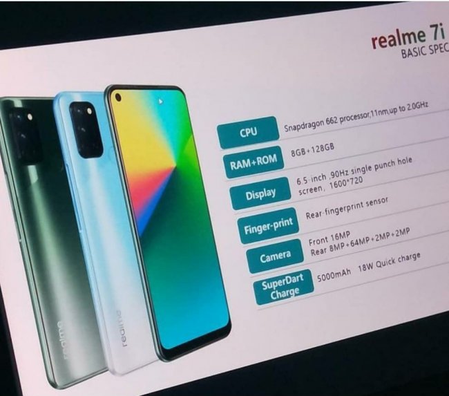 Благодаря утёкшему изображению, спецификации Realme 7i известны до анонса. Аппарат выйдут в двух расцветках. Его оснастят дырявым дисплеем на 6.5 дюймов с частотой обновления 90 Гц и разрешением HD+. Кроме этого, новинка получит чип Snapdragon 662, 8 ГБ ОЗУ, 128 ГБ ПЗУ, сканер отпечатков пальцев на задней стороне, батарею на 5000 мАч с 18-ваттной зарядкой, а также фронтальную камеру на 16 Мп и основную с четырьмя модулями. Главный сенсор получит разрешение 64 Мп. Его будут дополнять модули на 8 Мп + 2 Мп + 2 Мп.